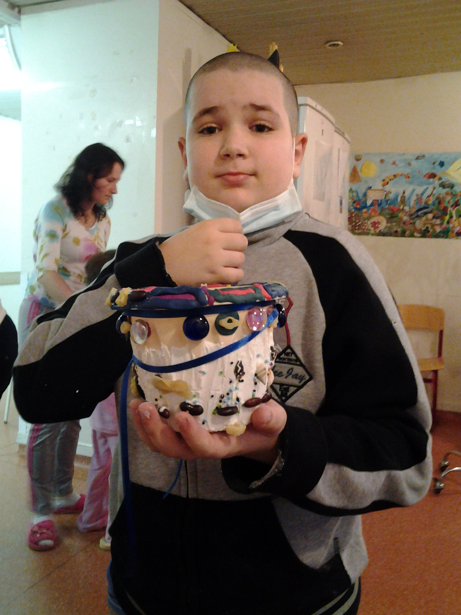 А Анька - молодец! И Санька - молодец! Итак, здравствуйте! Я решила разбудить свою совесть и написать о наших походах на Каширку. Анютка, правда, уже отчиталась в картинках, но... Итак в нашей дружной команде было три богатыря: Анютка Седова, Саня Мозжорин и я, ТС. Мы шли и почти ничего не боялись. Мы знали, что мы будем делать. Мы несли с собой огромную сумку всякого рукодельного и жизнь была прекрасна... Но... Такого аншлага у нас не было давно. Итак, все по порядку. На этот чудный вечер было запланировано создание произведений искусства под названием "Горшок цветочный необыкновенный украшенный" Для этого все было готово - закуплены горшки, пластилин и шпатлевка, накоплены залежи всяких красивых штучек и почти драгоценных стеклышек. Пока я бегала по палатам и разносила обещанные фильмы, журналы и всякую всячину, наши АСы начали работу. Уже на обратной дороге мы втроем пытались посчитать, сколько же нас было, но постоянно сбивались. Итак Красоту ваяли Адель, Дашка большая и Дашка маленькая с мамой, Маленький принц Олег, новичок Эдик, пятилетний Егор с красавицей мамой, всегда серьезная Маринка, мама Виталика (сам двухлетний Виталик приходил со строгой проверкой). Короче, когда пришла еще одна мамочка, ввиду отсутствия свободных горшков, в ход пошли пластиковые контейнеры, из которых в срочном порядке вытряхнули всякую мелочь. По холлу гуляли Миленка на руках у папы, годовалая красавица Настя с мамой и папой,по коридору с независимым видом прогуливался Мишка, которому вроде полегчало, но пока он был согласен только на разговоры. Ох как было здоровско! Честно-честно. А потом мы играли в настольные игры. Особенно всем понравилась игра про Карлсона. Ходи куда хочешь, только кубик правильно бросай. А за удачный ход можно было получить жетон с банкой варенья. Заодно в светской беседе выяснили, кто какое варенье больше любит. Больше всех радовалась Дашка маленькая. В общем и целом жизнь на данный промежуток времени у всех присутствующих на наших посиделках явно удалась. Вот таким путем... PS. Простите, что давно не писала. Сил не было совсем. Очень уж было невесело. PPS. А в следующую субботу доблестная команда идет без предводителя разбойников.Короче, совершенно самостоятельно. И я верю, у них все получится.