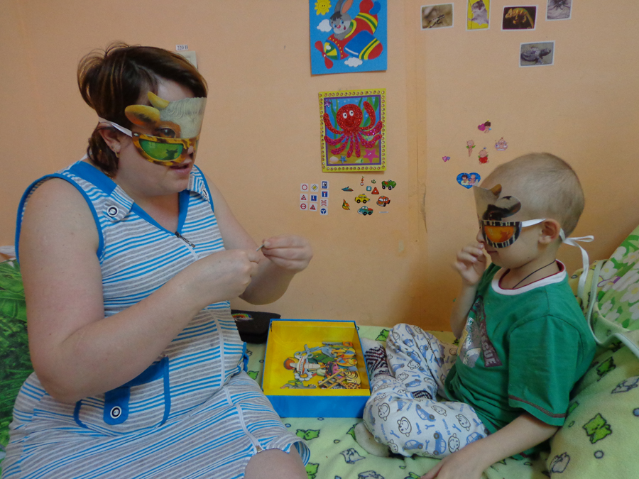 Сначала я пришла во вторую палату. Там были Максим с папой Сергеем и Данила Куц с мамой Светой. У меня были с собой две игры: маленькая версия «Доббля» и «Головоноги».