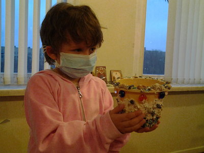 А Анька - молодец! И Санька - молодец! Итак, здравствуйте! Я решила разбудить свою совесть и написать о наших походах на Каширку. Анютка, правда, уже отчиталась в картинках, но... Итак в нашей дружной команде было три богатыря: Анютка Седова, Саня Мозжорин и я, ТС. Мы шли и почти ничего не боялись. Мы знали, что мы будем делать. Мы несли с собой огромную сумку всякого рукодельного и жизнь была прекрасна... Но... Такого аншлага у нас не было давно. Итак, все по порядку. На этот чудный вечер было запланировано создание произведений искусства под названием "Горшок цветочный необыкновенный украшенный" Для этого все было готово - закуплены горшки, пластилин и шпатлевка, накоплены залежи всяких красивых штучек и почти драгоценных стеклышек. Пока я бегала по палатам и разносила обещанные фильмы, журналы и всякую всячину, наши АСы начали работу. Уже на обратной дороге мы втроем пытались посчитать, сколько же нас было, но постоянно сбивались. Итак Красоту ваяли Адель, Дашка большая и Дашка маленькая с мамой, Маленький принц Олег, новичок Эдик, пятилетний Егор с красавицей мамой, всегда серьезная Маринка, мама Виталика (сам двухлетний Виталик приходил со строгой проверкой). Короче, когда пришла еще одна мамочка, ввиду отсутствия свободных горшков, в ход пошли пластиковые контейнеры, из которых в срочном порядке вытряхнули всякую мелочь. По холлу гуляли Миленка на руках у папы, годовалая красавица Настя с мамой и папой,по коридору с независимым видом прогуливался Мишка, которому вроде полегчало, но пока он был согласен только на разговоры. Ох как было здоровско! Честно-честно. А потом мы играли в настольные игры. Особенно всем понравилась игра про Карлсона. Ходи куда хочешь, только кубик правильно бросай. А за удачный ход можно было получить жетон с банкой варенья. Заодно в светской беседе выяснили, кто какое варенье больше любит. Больше всех радовалась Дашка маленькая. В общем и целом жизнь на данный промежуток времени у всех присутствующих на наших посиделках явно удалась. Вот таким путем... PS. Простите, что давно не писала. Сил не было совсем. Очень уж было невесело. PPS. А в следующую субботу доблестная команда идет без предводителя разбойников.Короче, совершенно самостоятельно. И я верю, у них все получится.