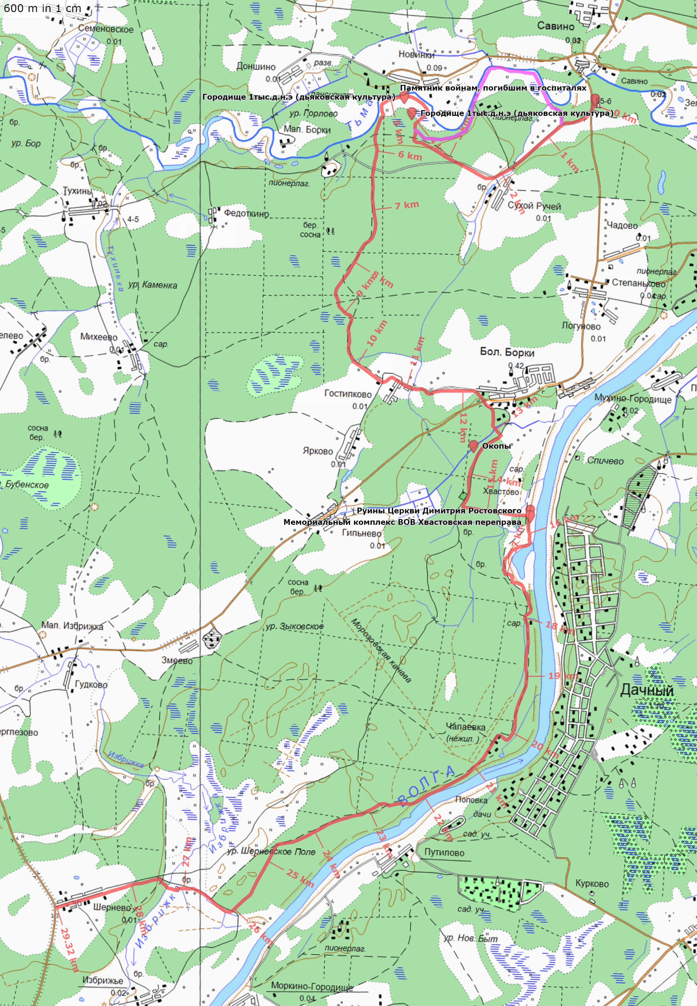 Нитка маршрута: д.Савино - Городище Новинки (река Тьма) - Большие Борки - ур.Хвастово (река Волга) - д.Чапаевка - д.Шернево.