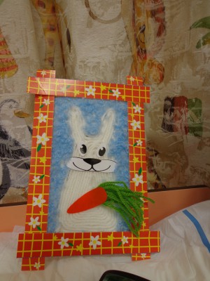 Сначала я была в амбулансе. Там лежали Дима Усачёв, маленькая Диана (или Дина) с мамой Кариной, взрослая Света и ещё одна девочка с мамой, которые, пока я была, ужинали. Здесь мы делали картины из шерсти. Я накануне купила три набора, но принцип у них оказался такой простой, что впредь можно делать такую штуку самим. На бумагу с толсто прорисованным контуром клеится тонкий двухсторонний скотч. И потом, к этому скотчу вдоль просвечиваюзих контуров приклеиваются шерстяные нитки. Получается рисунок, выложенный шерстью. Дима выбрал себе двух котов, сидящих пол луной. Мама Карина – зайчика с морковкой. А третья мама взяла себе и дочке жирафа. Светы в момент раздачи работ в палате не было, потом, когда пришла, она помогала Диме Усачёву. В седьмой палате лежал Дима Рыжов. С ним и его мамой мы поиграли в «Контуры». В этой игре много разных фигурок из плотного картона, которые надо узнавать с закрытыми глазами на ощупь, по контурам. Димке понравилось. Потому в эту же игру играли с Димой Чемагиным и его мамой. Дима Че постарше, чем Дима Ры. Поэтому с младшим Димой мы сначала просто посмотрели на все предметы, которые были в коробке и проговорили, как они называются. А со старшим Димой знакомство с предметами заранее было излишним, он и так почти всё угадал. Очень сложным для узнавания оказался почему-то самолёт. И - не почему-то, а вполне понятно, почему - улитка.