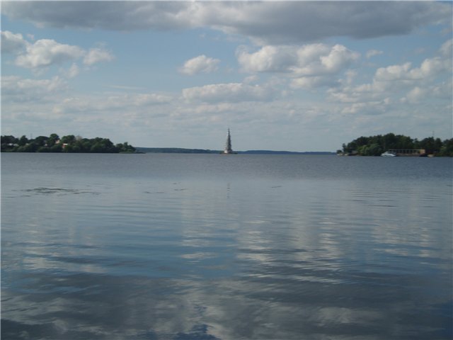 Я, к сожалению, не смогу прийти на встречу 2-го, потому что уезжаю. Но у меня появилась идея насчёт того, куда можно пойти. На границе Тверской и Ярославской областей есть город Калязин, а рядом с ним затопленный храм, только колокольня из воды торчит. Я прикладываю фотку. По-моему, это должно быть очень красиво и необычно. Недалеко от этого самого Калязина - Углич, туда тоже, наверное, можно заехать. А чуть дальше - город Мышкин, абсолютно замечательное место.