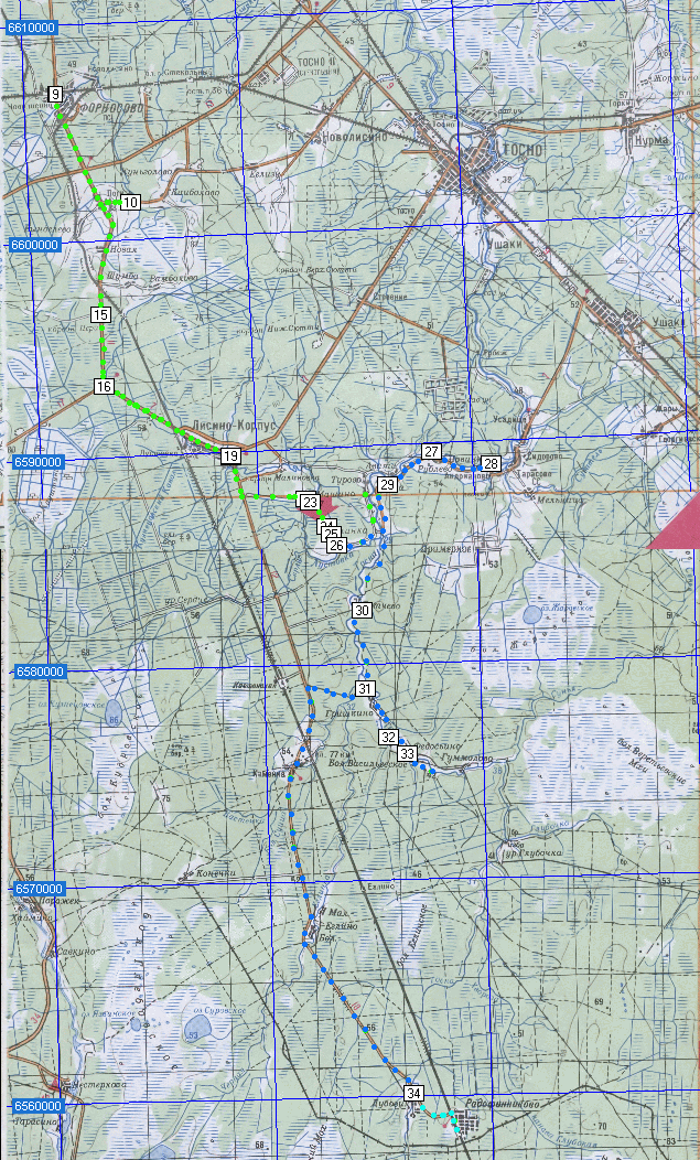 Вот, отметил на карте реальный маршрут велогруппы. Зеленым цветом первый день пути, синим - второй, ярко-зеленым - третий. Соответственно, cтоянки были между цветными переходами. В квадратиках - порядок маршрутных точек по GPS (пропуски нумерации связанны с глюками)