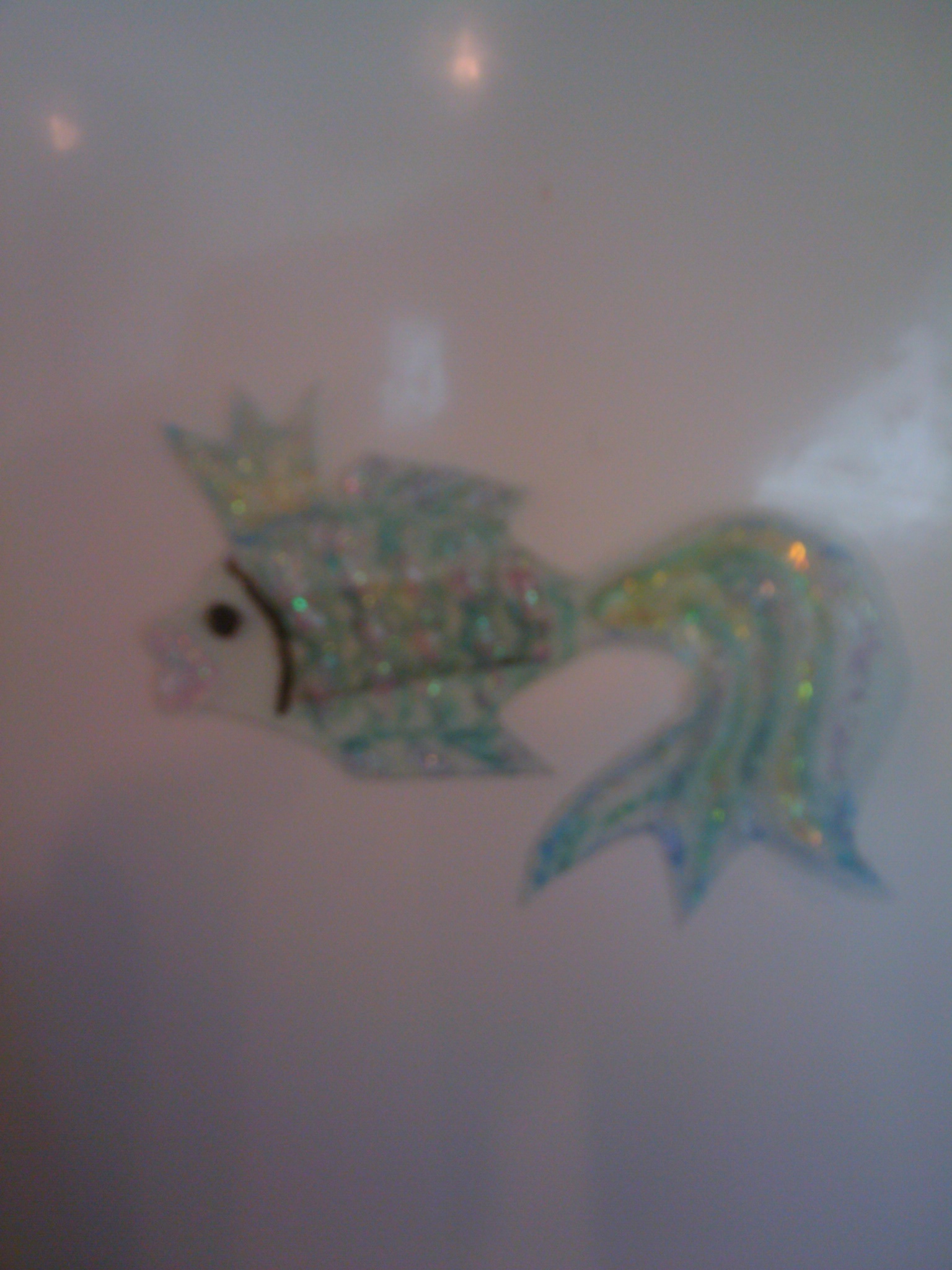 В понедельник занятия не было, потому что был праздник, а в четверг 16 июня мы делали магнитики. Материал был необычный, основу (бабочек и рыбок) мы вырезали из бутылок. Точнее, для малышей я вырезала дома заранее, и они просто украшали магнитики блестками, а старшие девочки и мамы рисовали, вырезали и украшали сами. Малыши быстро сделали себе по магнитику и растащили их по палатам на просушку. Анюта тоже поучаствовала, несмотря на то, что была привязана - мы ей передали розовых блесток и бабочку прямо в палату) Такие вот получились магнитики у Зули: . А Карина сделала двух бабочек, которых можно цеплять на футболку: . Одна из мам делала золотую рыбку, пока сынишка у нее на руках отходил от наркоза, очень красивая вышла: . Потом Карина с Зелый решили повторить золотых рыбок, по-моему, у Карины вышло очень здорово: . В общем, я даже пожалела, что не взяла фотик (боялась, что не успею и детям помогать, и фотографировать)!